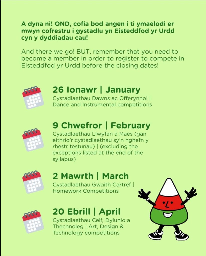 Remember that you need to become a member in order to register to compete in Eisteddfod yr Urdd before the closing dates! Register: https://www.urdd.cymru/cy/ymuno/